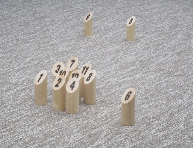 ルールは、モルックを投げて倒れた棒(スキットル)の内容によって得点を加算していき、先に50点ピッタリになった方が勝ちで、ゲーム終了となります。