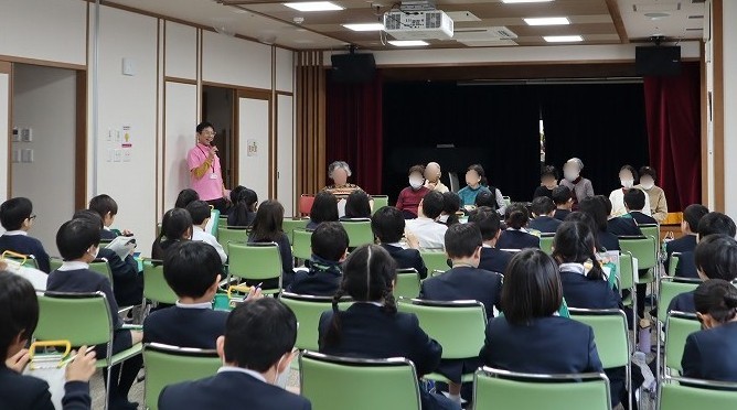 生徒さんが、利用者の小学生頃の衣食住や学校生活、遊び、流行などについて質問し、現在との違い学んでいくというイベントで、中央小からは生徒48人と先生4人に来館していただきました。