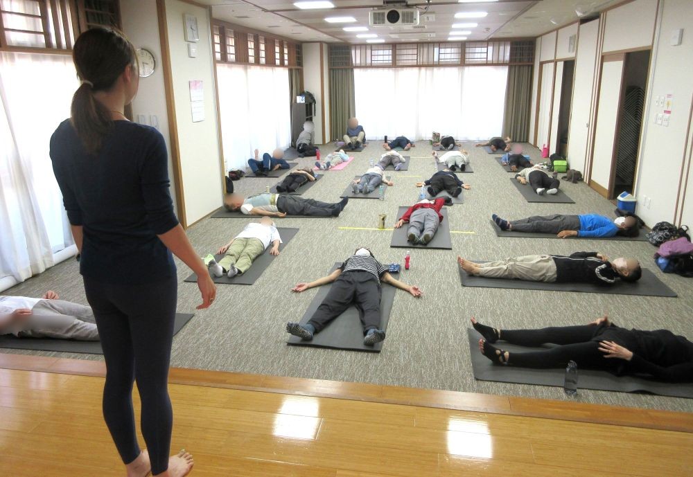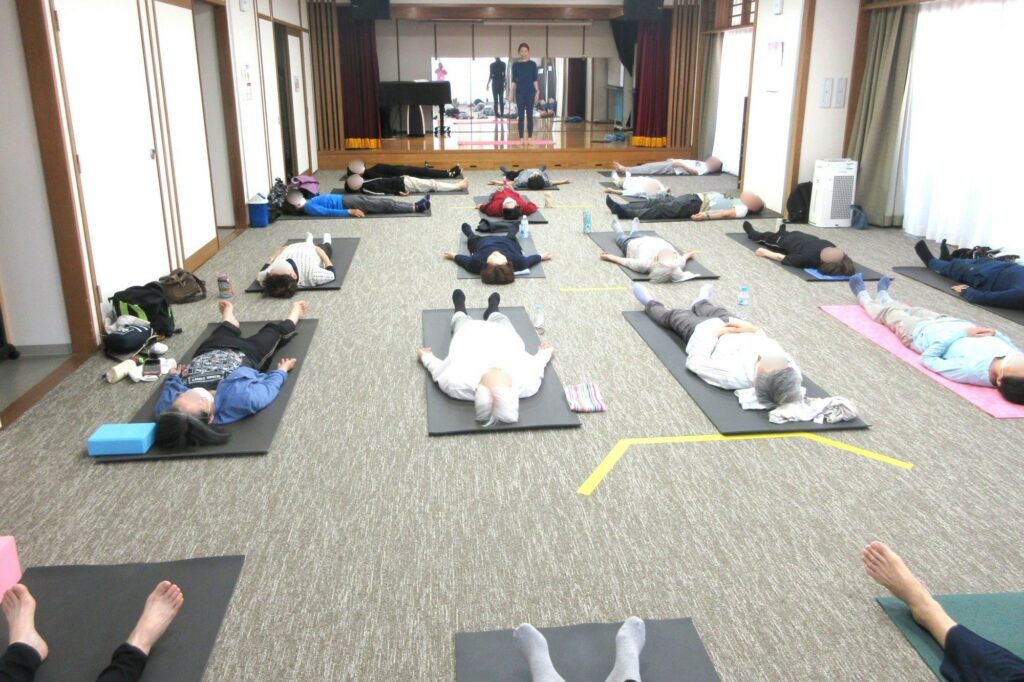 最初は、軽くヨガのアーサナ(ポーズ)を実践し、その後に部屋を暗くして横になります。横になっている時間は、だいたい30分くらいでしたが、寝落ちしてしまう方がけっこういらっしゃいました。