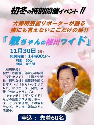 11月30日の午後2時、有名芸能リポーターの石川敏男氏が来館し、芸能界のあの話、この話など、秘話を明かしてくれちゃいます。 皆さんの質問もたくさん受け付けますので、お楽しみに!