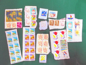 当館の経理担当が無造作にミックスペーパー入れに放り込んでいた業者等の郵便物から、あるスタッフが、数年にわたり、デザイン的にキレイな切手などを自らの趣味から、切り取っていたそうなのです。で、これも驚きですが、その中から社協の封筒に「使用済みの切手、書き損じはがきをご寄付ください」という一文を見つけ、それならば!と思ったそうです。