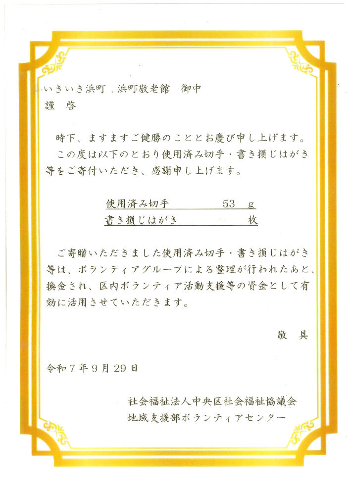 この活動は中央区社会福祉協議会 地域支援部ボランティアセンターが使用済み切手を回収し、換金して福祉活動の資金に充てていて、全国的に行われているそうです。
